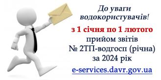 Термін надання звітності з 01 січня по 01 лютого 2025 року в електронній формі через Портал електронних послуг Державного агентства водних ресурсів України за посиланням: https://e-services.davr.gov.ua/.