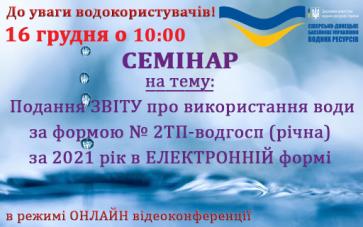 16 грудня о 10:00 в режимі відеоконференції відбудеться онлайн-СЕМІНАР на тему: «Подання ЗВІТУ про використання води за формою № 2ТП-водгосп (річна) за 2021 рік в ЕЛЕКТРОННІЙ формі».