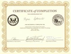 Ірина Сидоренко, начальник відділу водних об’єктів і моніторингу вод, отримала сертифікат, закінчивши навчання у семінарі з питань водокористування, яке провели Ніколас Аумен (Регіональний науковий радник і координатор програми пріоритетних екосистем Еверглейдс, представник Геологічної служби США) та Роман Фердінанд (представник Офісу Міністерства внутрішніх справ у Іллінойсі, що спеціалізується на управлінні водними ресурсами, гідрогеолог).