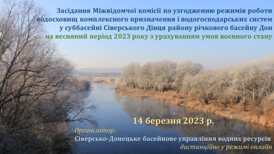 14 березня відбудеться онлайн-засідання Міжвідомчої комісії по узгодженню режимів роботи водосховищ комплексного призначення і водогосподарських систем у суббасейні Сіверського Дінця району річкового басейну Дон (крім тимчасово окупованої території)* на весняний період 2023 років з урахуванням умов воєнного стану.