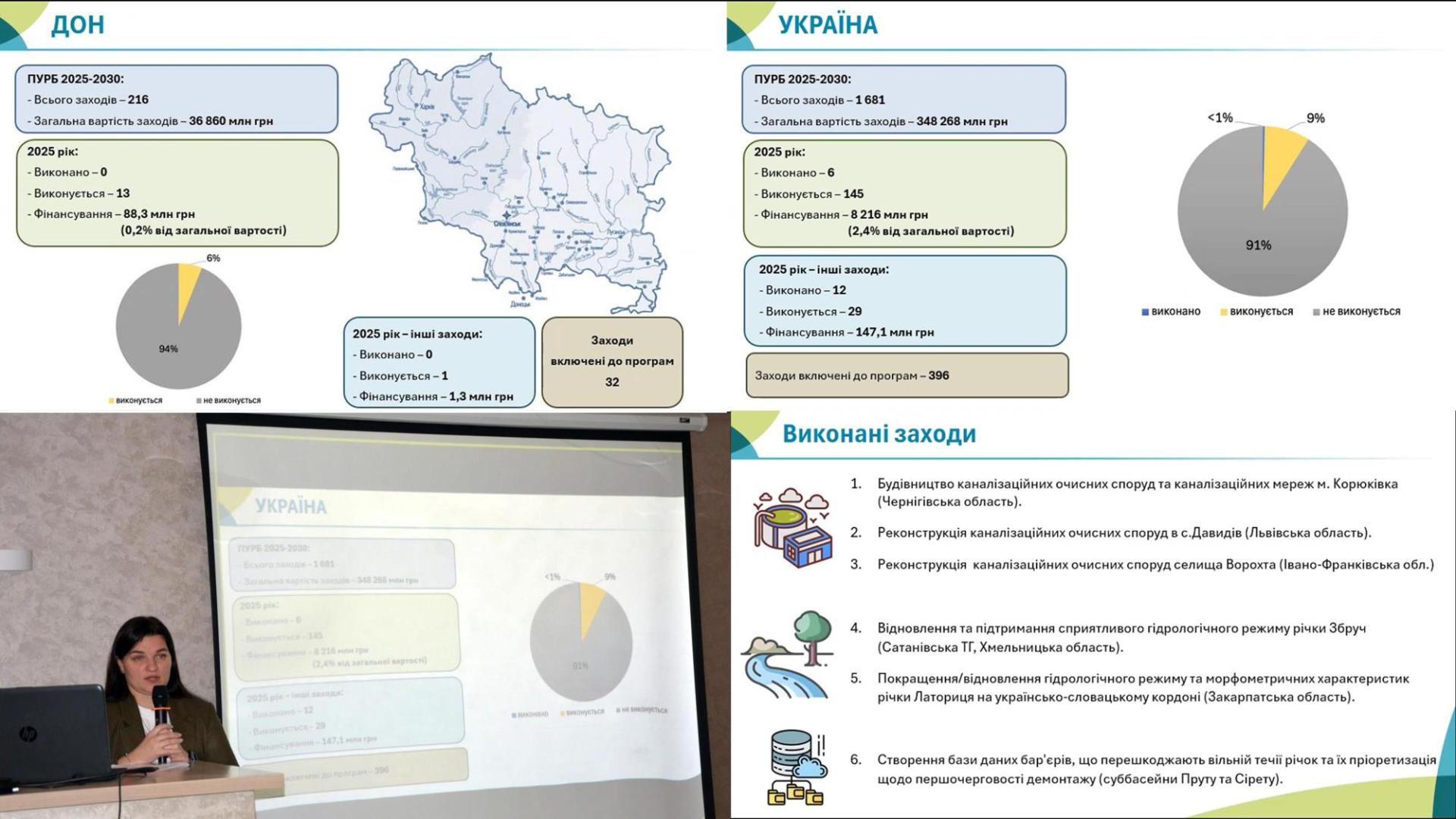 Голова Держводагентства зазначив, що серед заходів, які не увійшли до ПУРБ, але відповідають їхнім цілям, наразі 12 уже виконано, а 29 перебувають у процесі реалізації, при цьому загальна вартість цих робіт за 2025 рік склала 147 млн грн. Водночас 396 заходів (24%), що включені до ПУРБ, наразі не виконуються, але вже включені до державних, регіональних та обласних цільових програм.