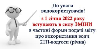 Сіверсько-Донецьке басейнове управління водних ресурсів інформує, що з 01.01.2022 вступають в силу ЗМІНИ в частині форми подачі звіту про використання води за формою 2ТП-водгосп (річна), відповідно до наказу Міндовкілля від 18.12.2020 № 375 «Про затвердження Змін до Порядку ведення державного обліку водокористування та Порядку функціонування модуля «Подання звіту про використання води в електронній формі» Порталу електронних послуг Державного агентства водних ресурсів України».