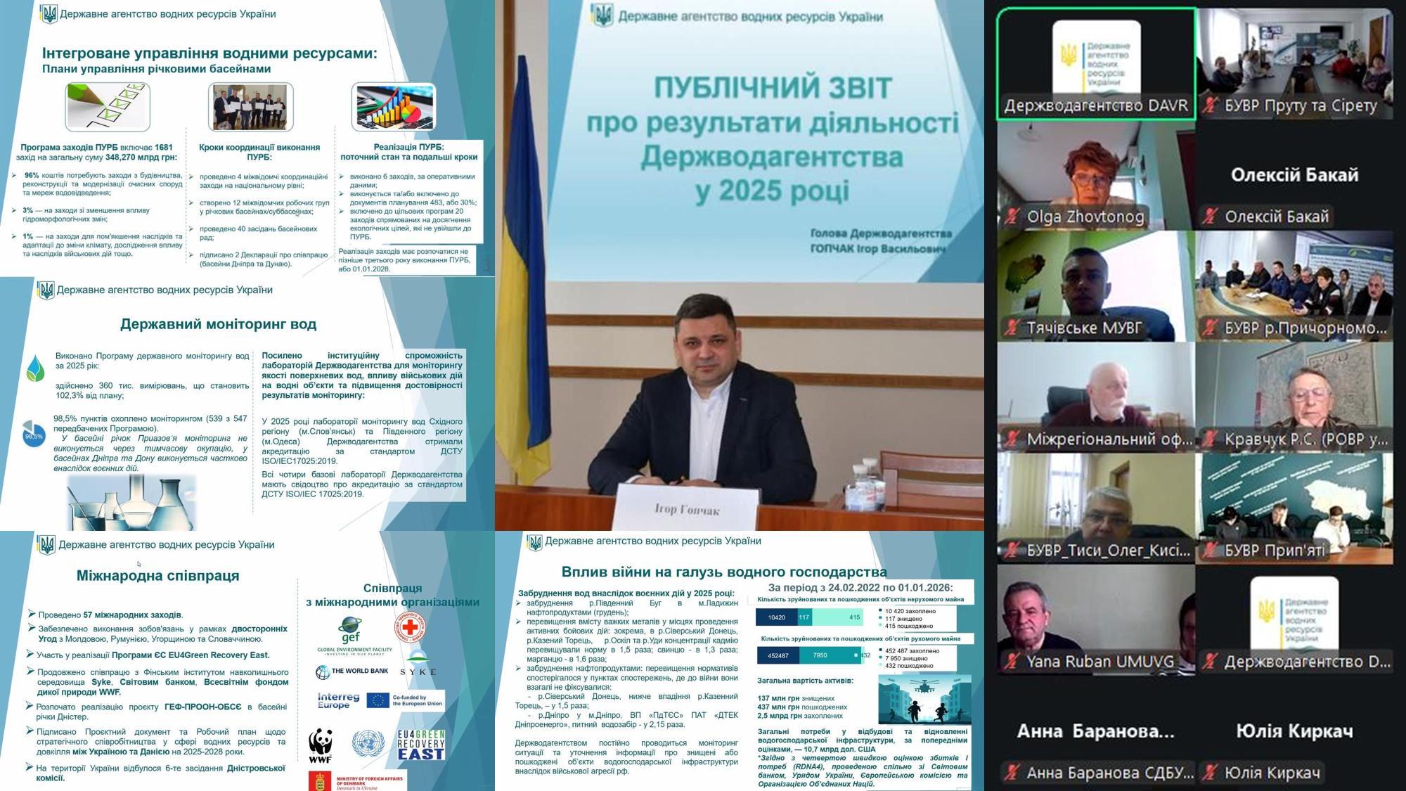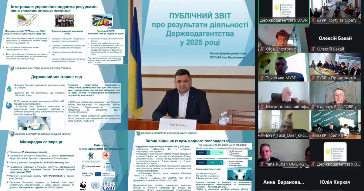 24 лютого Голова Державного агентства водних ресурсів України Ігор Гопчак представив публічний звіт про результати діяльності відомства у 2025 році. Захід відбувся за участі фахівців апарату Держводагентства, а також керівників водогосподарських організацій та представників громадськості в онлайн форматі. До участі в заході у форматі відеоконференції долучилися і фахівці Сіверсько-Донецького басейнового управління водних ресурсів.