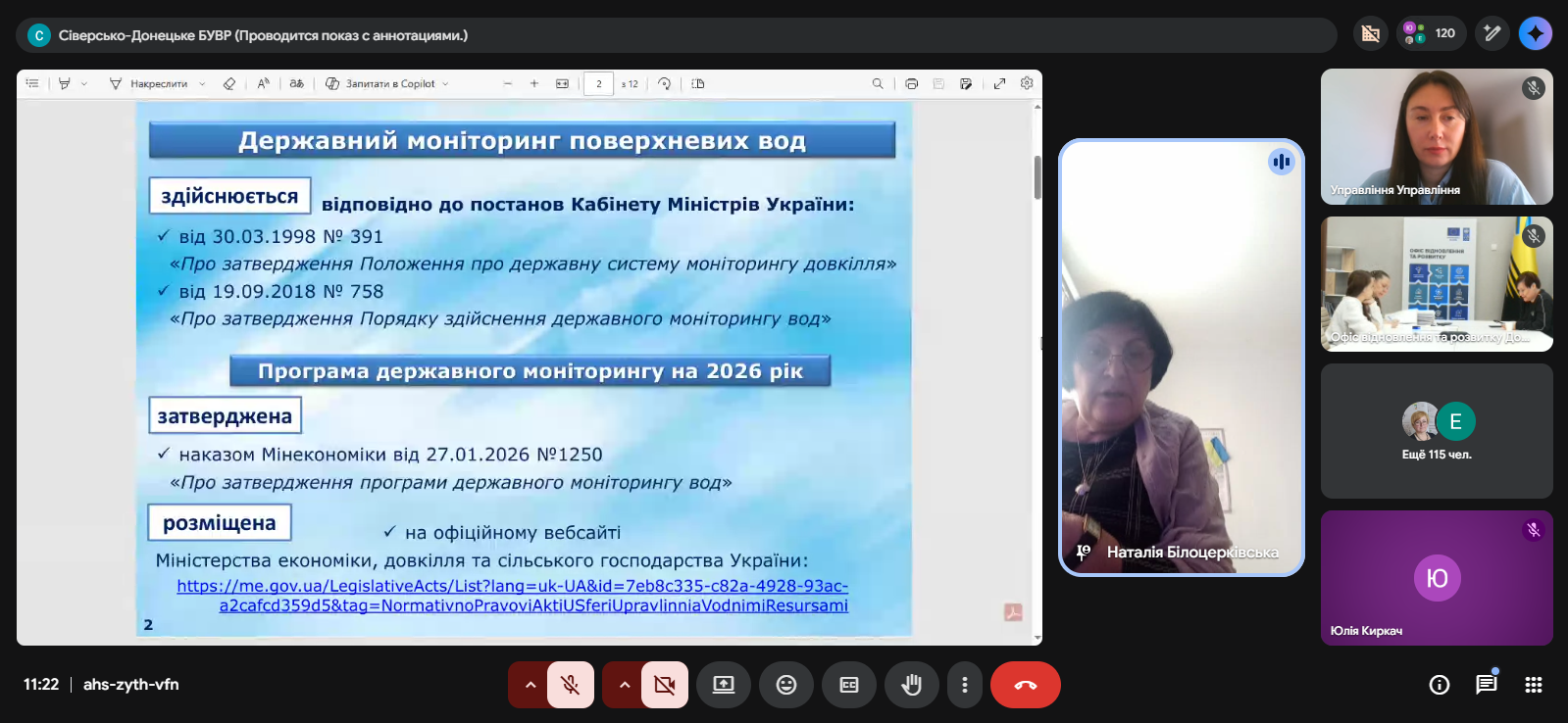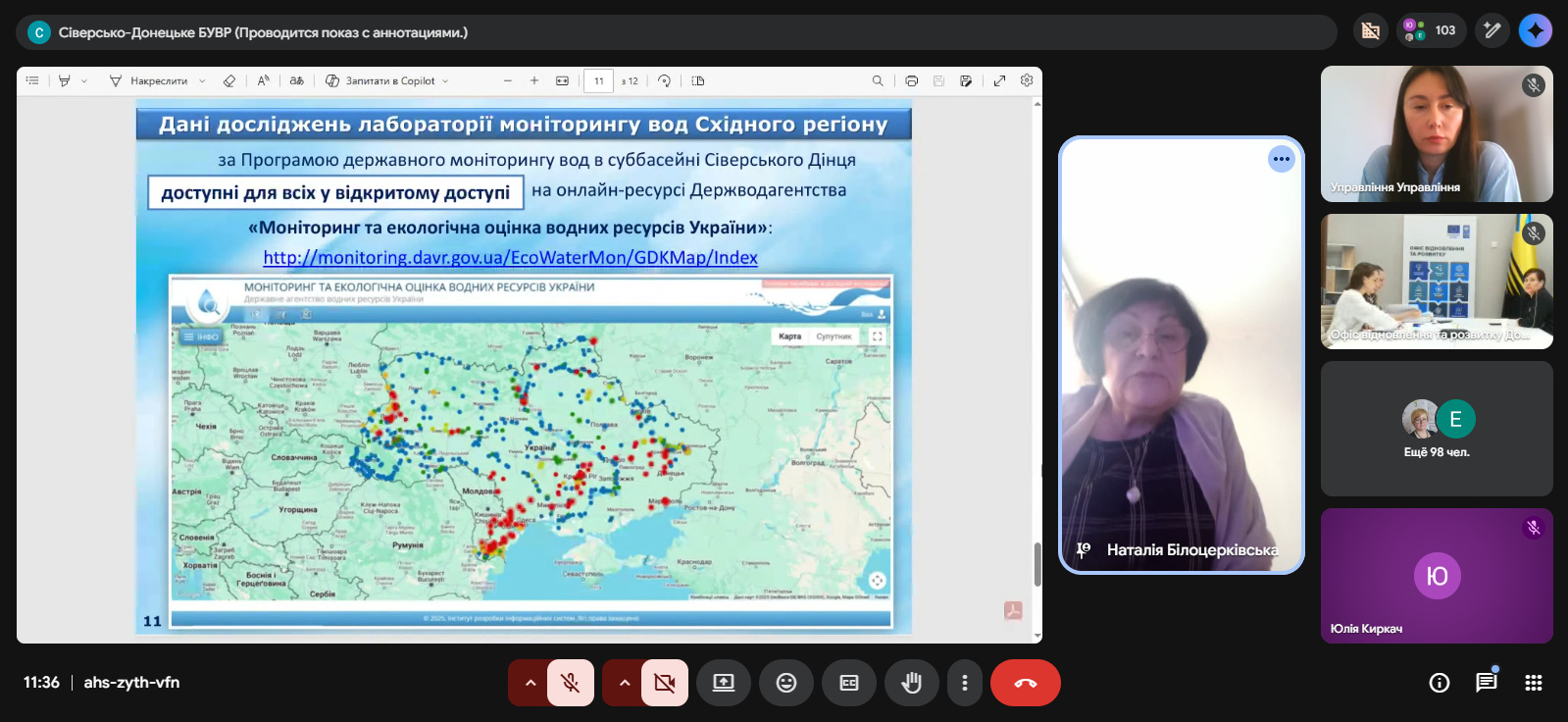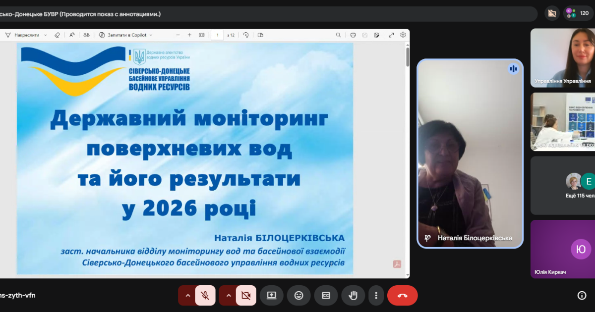 Заступник начальника відділу моніторингу вод та басейнової взаємодії Сіверсько-Донецького БУВР Наталія Білоцерківська поінформувала учасників семінару про виконання державного моніторингу поверхневих вод у 2026 році та його результати.