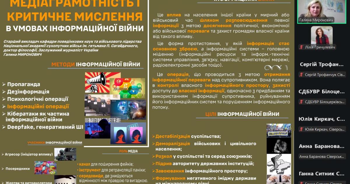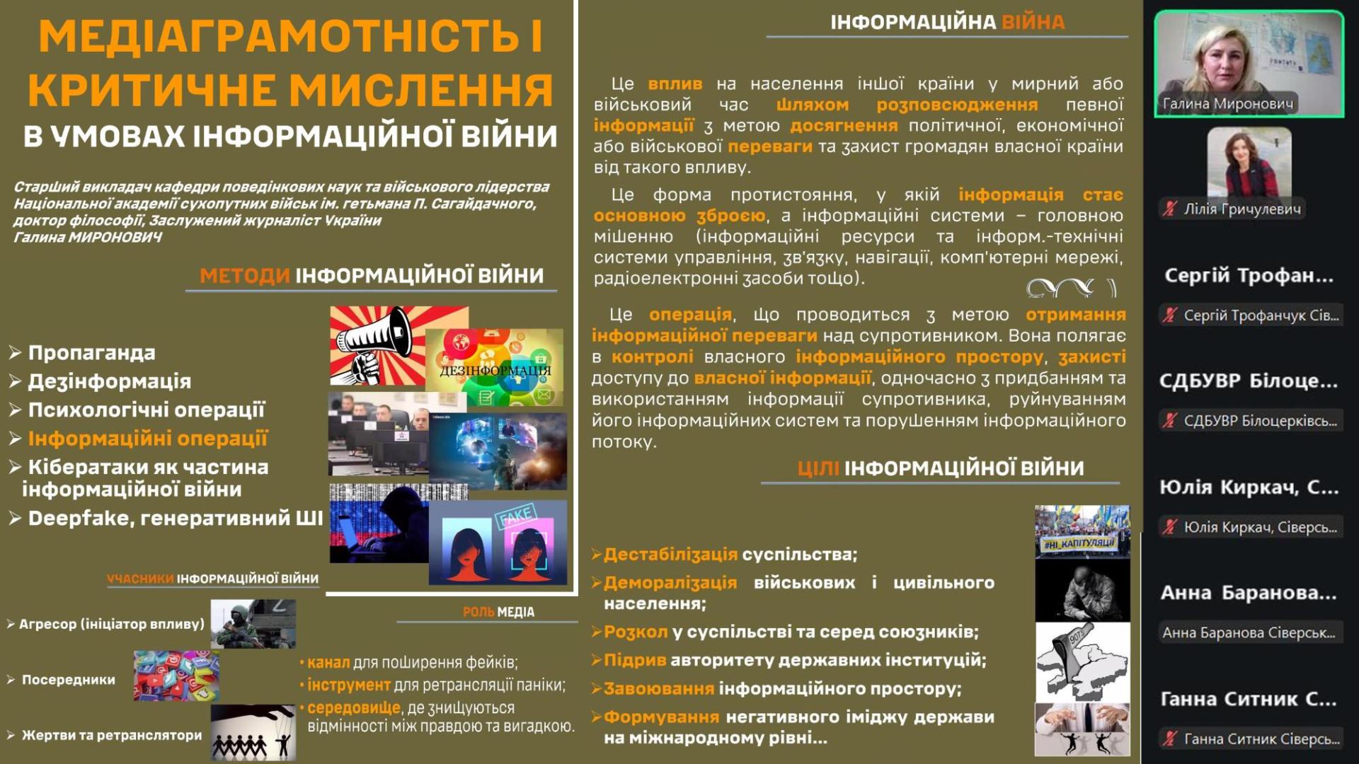 Тренерка Галина Миронович – старший викладач кафедри поведінкових наук та військового лідерства Національної академії сухопутних військ ім. Петра Сагайдачного, доктор філософії, Заслужений журналіст України – докладно й з наочними прикладами розповіла слухачам, як розпізнавати фейки, маніпуляції та пропаганду, розкрила вплив алгоритмів соцмереж на формування інформаційних бульбашок та ознайомила з інструментами фактчекінгу.