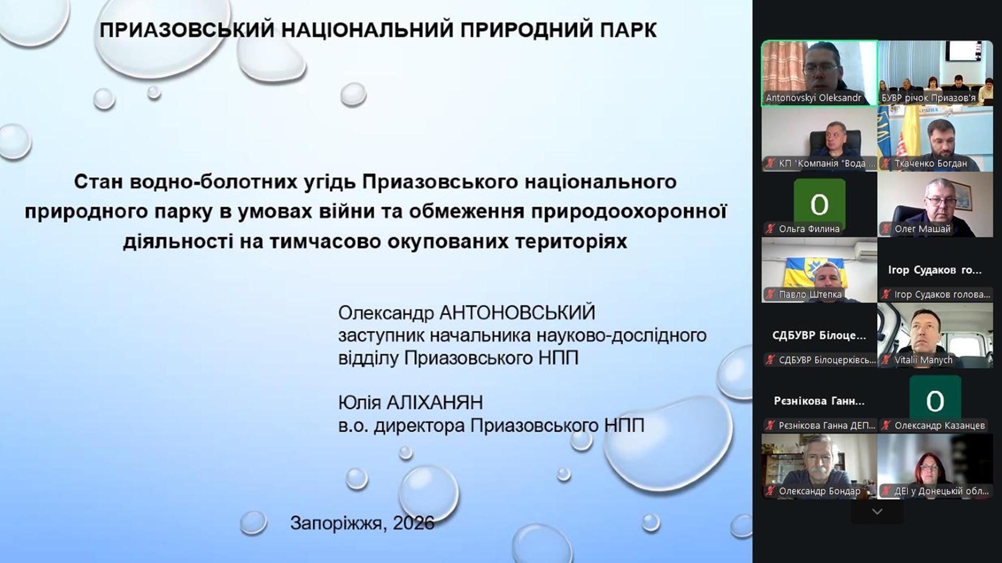 Заступник начальника науково-дослідного відділу Приазовського національного природного парку, старший викладач кафедри геоекології і землеустрою Таврійського державного агротехнологічного університету імені Дмитра Моторного Олександр Антоновський представив інформацію про стан водно-болотних угідь Приазовського національного природного парку в умовах війни та обмеження природоохоронної діяльності на тимчасово окупованих територіях.