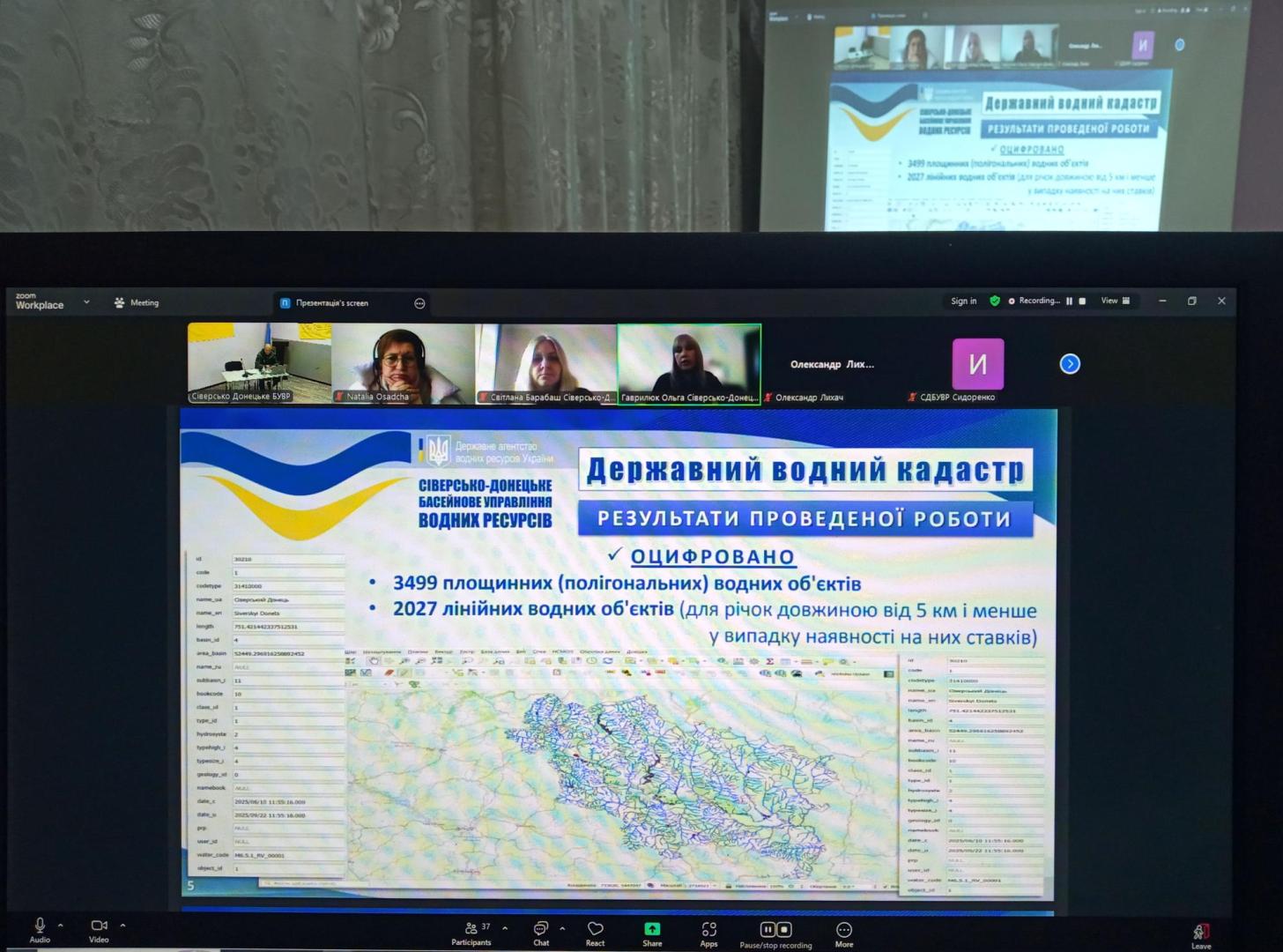 Члени басейнової ради та представники заінтересованих сторін розглянули результати роботи з оновлення Державного водного кадастру за розділом «Поверхневі води» в частині обліку поверхневих водних об’єктів у суббасейні р. Сіверський Донець та суббасейні Нижнього Дону: оцифровано 3499 полігональних та 2027 лінійних водних об’єктів для створення сучасного відкритого водного кадастру європейського рівня.
