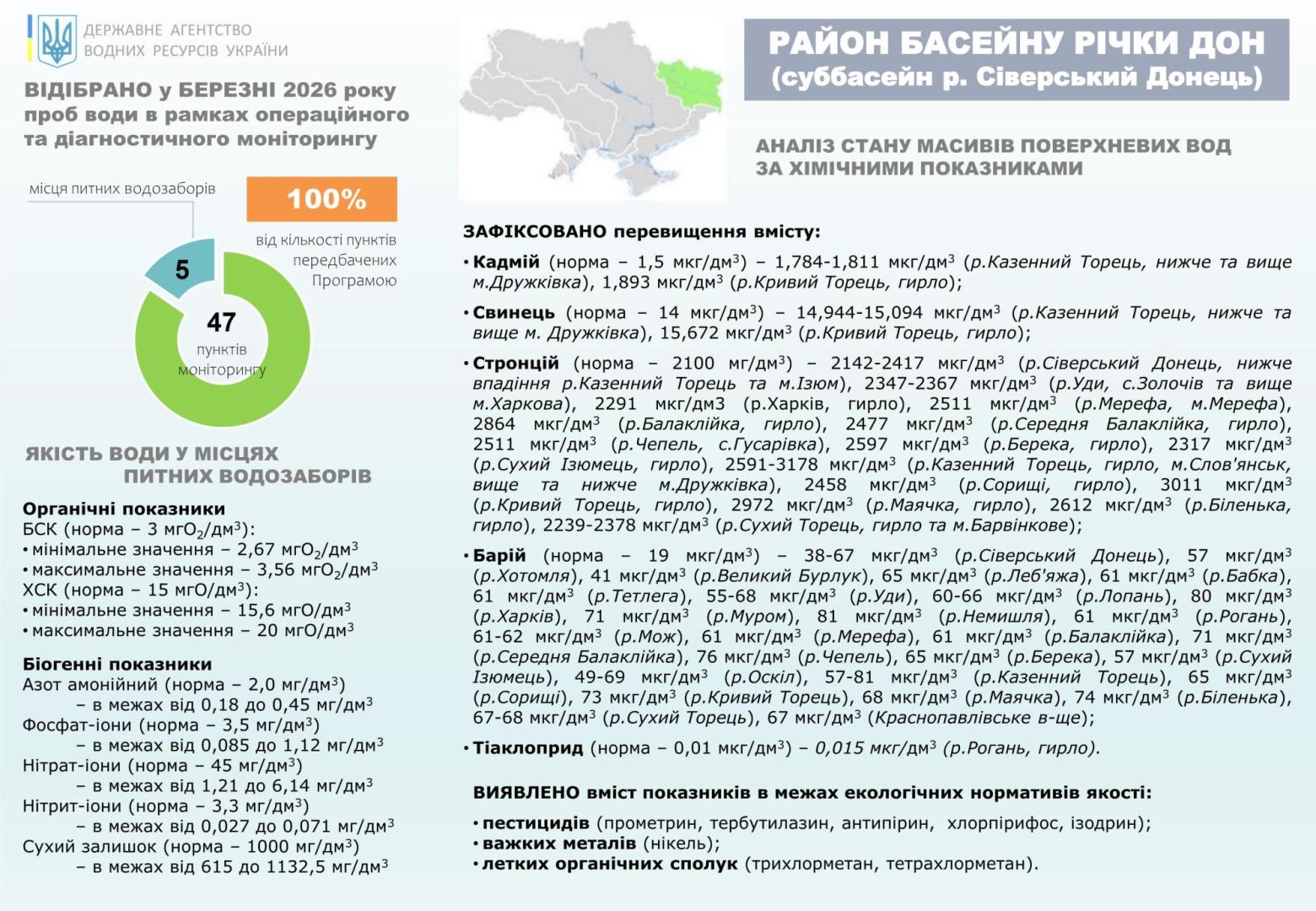 Якісний стан водних об’єктів суббасейну Сіверського Дінця у березні 2026 року