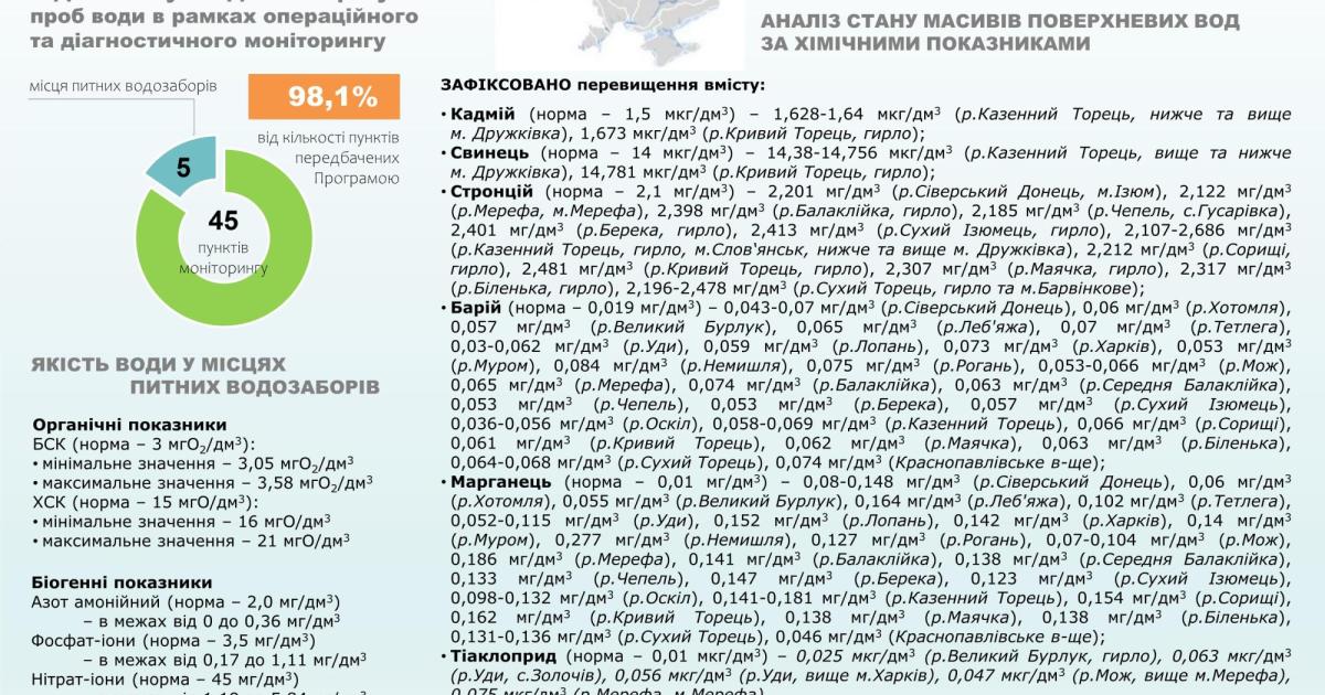 В місцях питних водозаборів концентрації показників – у межах середньобагаторічних значень.