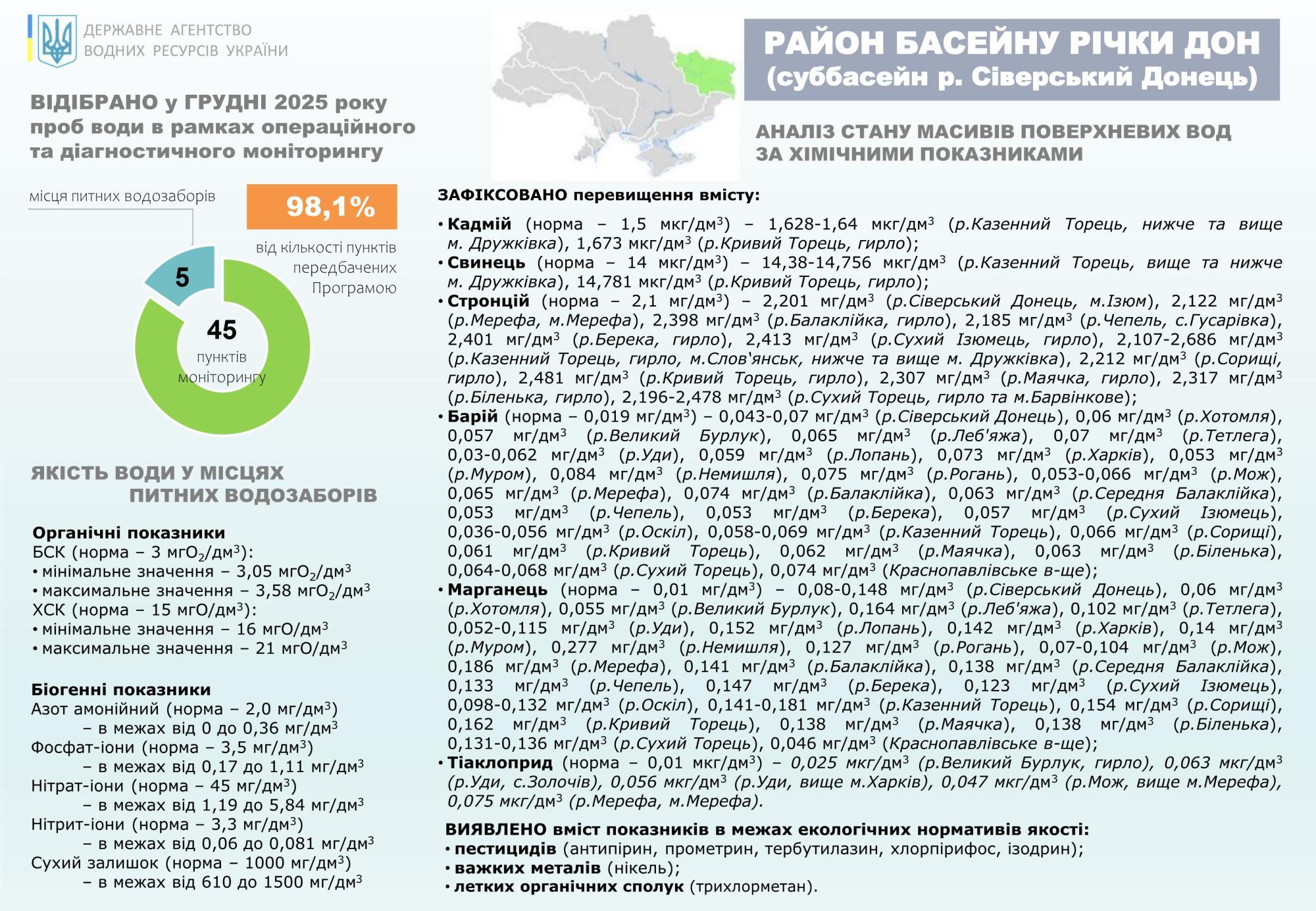 Якісний стан водних об’єктів суббасейну Сіверського Дінця у грудні 2025 року
