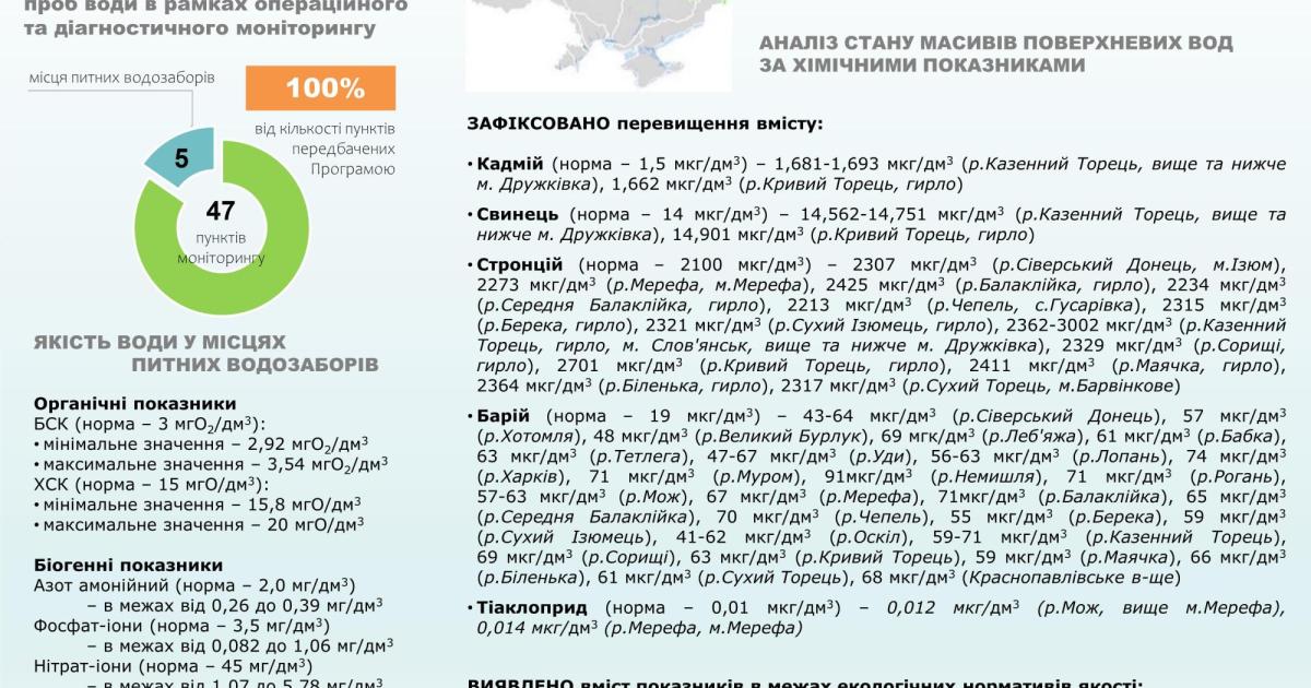 В місцях питних водозаборів концентрації показників – у межах середньобагаторічних значень.