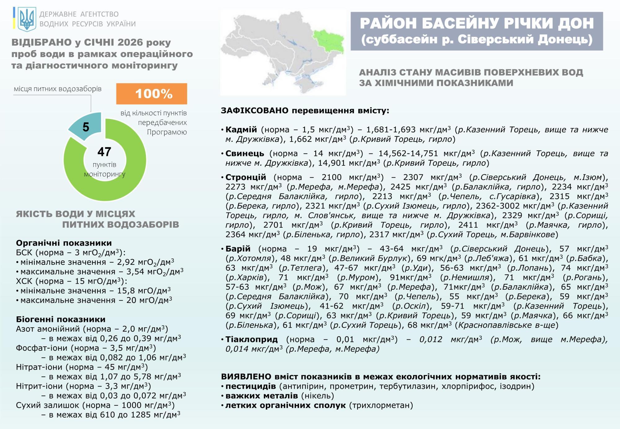 Лабораторія моніторингу вод Східного регіону Сіверсько-Донецького басейнового управління водних ресурсів продовжує виконання моніторингу поверхневих вод у суббасейні Сіверського Дінця району басейну річки Дон в тих пунктах, де це дозволяє оперативна військова ситуація.