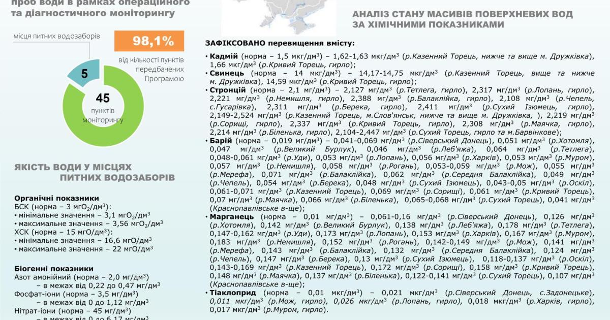 В місцях питних водозаборів концентрації показників – у межах середньобагаторічних значень.