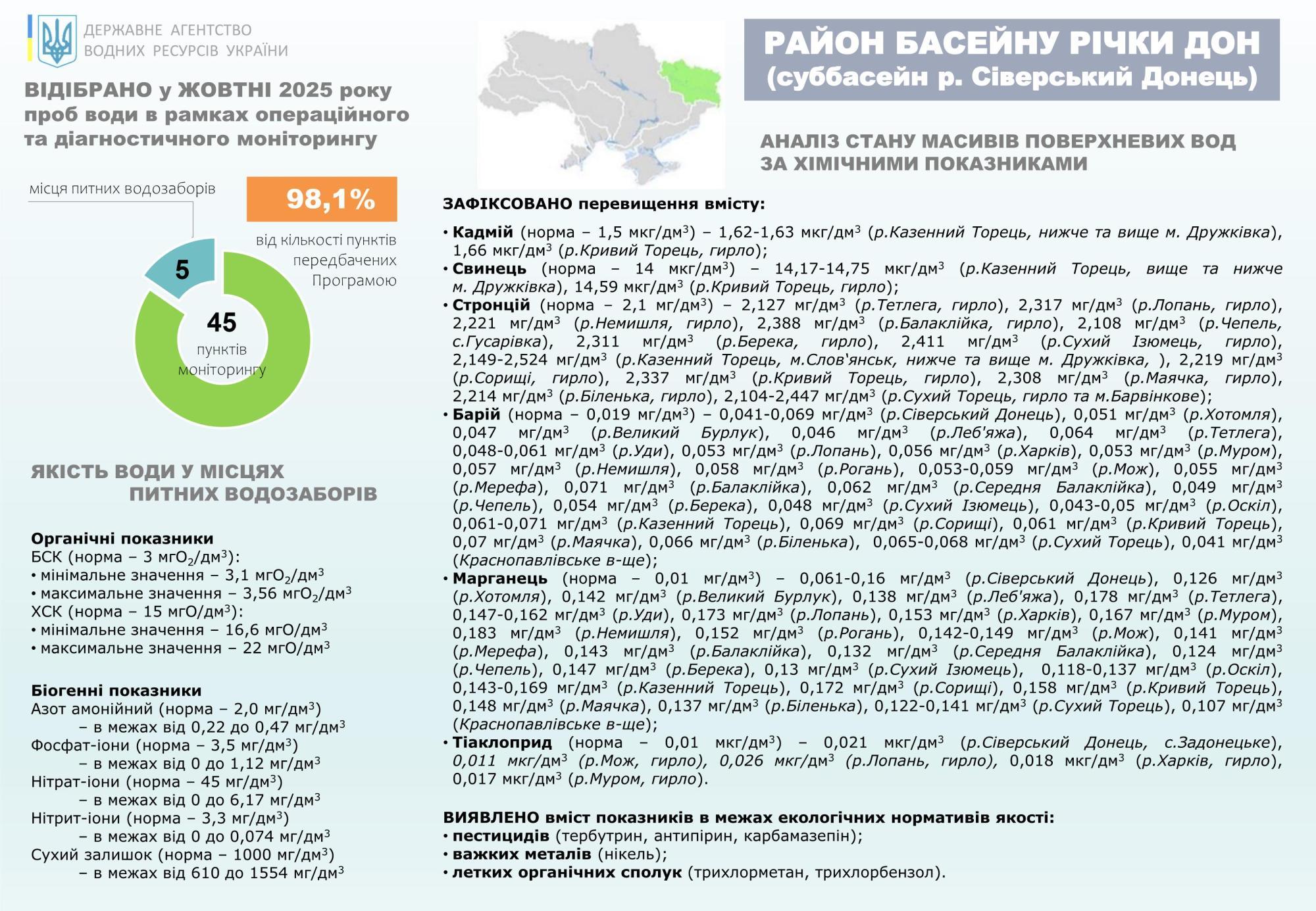 Лабораторія моніторингу вод Східного регіону Сіверсько-Донецького басейнового управління водних ресурсів продовжує виконання моніторингу поверхневих вод у суббасейні Сіверського Дінця району басейну річки Дон в тих пунктах, де це дозволяє оперативна військова ситуація.