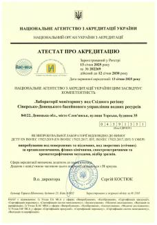 *Лабораторія моніторингу вод Східного регіону акредитована відповідно до визнаного міжнародного стандарту ISO/IEC 17025. Ця акредитація демонструє технічну компетенцію для визначеної сфери акредитації та функціонування системи управління якістю лабораторії. Акредитація за ДСТУ EN ISO/IEC 17025:2019 лабораторій, що здійснюють хімічний аналіз та моніторинг води, є вимогою національного законодавства та зобов’язанням у рамках імплементації Директиви Комісії 2009/90/ЄС, що встановлює технічні специфікації для хімічного аналізу та моніторингу стану води відповідно до Директиви 2000/60/ЄС Європейського Парламенту та Ради.