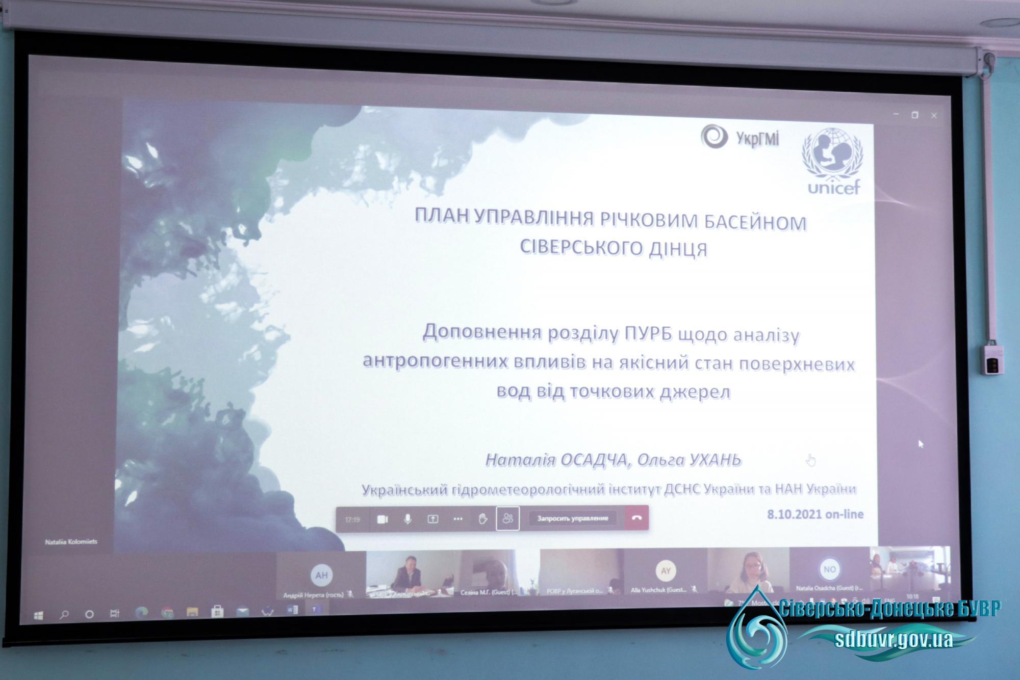 Сьогодні, 8 жовтня, в Сіверсько-Донецькому басейновому управлінні водних ресурсів відбулась нарада із заключного обговорення звіту «Доповнення розділу Плану управління річковим басейном Дону щодо аналізу антропогенних впливів на якісний стан поверхневих вод від точкових джерел. Оцінка дозволів на спецводокористування підприємств», який розроблено Українським гідрометеорологічним інститутом ДСНС України для Представництва Дитячого Фонду ООН (ЮНІСЕФ) в Україні.